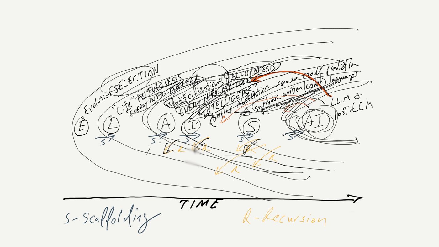 It is perhaps not altogether surprising that language would be (for now) the primary scaffold upon which artificialized intelligence is built. It is also assured that the artificialization of language will recursively transform the scaffold of language on which it depends, as much as the emergence of coded language affected social intelligence, the scaffold on which it depends, and intelligence affects allopoietic artificialization, the scaffold on which it depends, and so on. Ultimately, the long arc of bidirectional recursion may suggest that the emergence of increasingly complex artificialized intelligence will affect the direction of life itself, how it replicates and how it directs and is directed by evolutionary selection.