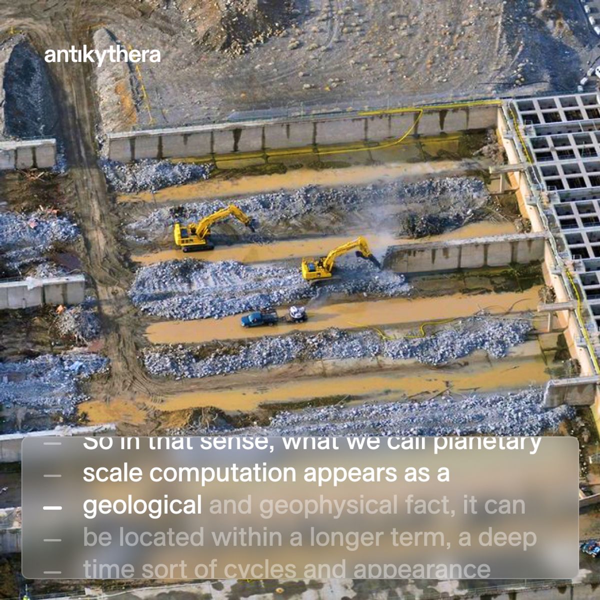 The name Antikythera refers more generally to computational technology that discloses and accelerates the planetary condition of intelligence. More than one particular mechanism, it is a growing genealogy of technologies, some of which—like planetary computation infrastructures—we not only use but also inhabit.