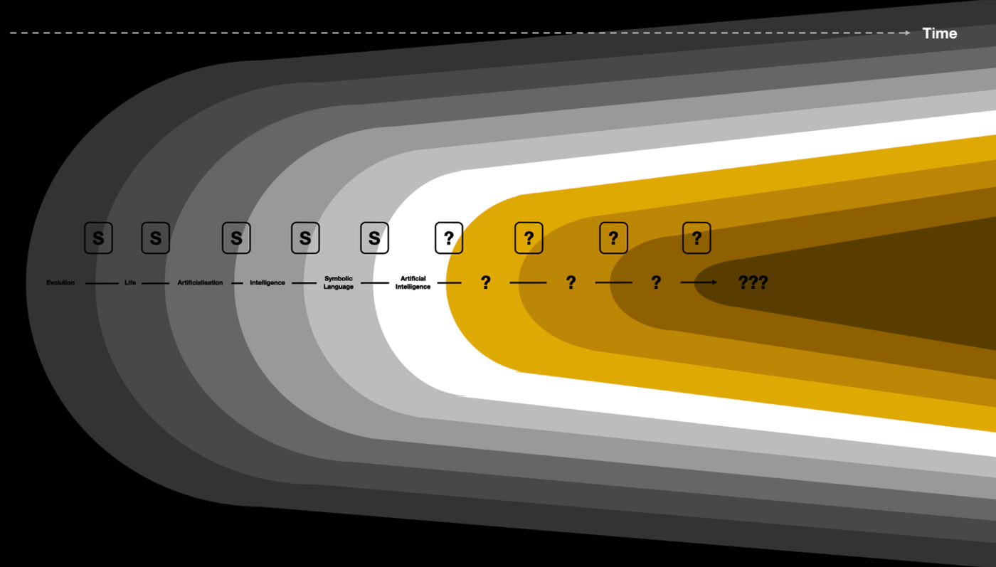 The earliest forms of artificialization were driven by primordial forms of intelligence and vice versa. Each evolved in relation to other to such a degree that from certain perspectives they could be seen as the same planetary phenomena: autopoietic matter capable of allopoiesis (and technology), because it is intelligent enough and capable of devoting energy to intelligence, because it is allopoietic. Regardless, intelligence is at least a driving cause of the technological and planetary complexification of artificialization as an effective process. The question that demands to be asked is then, “What happens when intelligence, the driving force of artificialization for millions of years, is itself artificialized?” What is foreseeable through the artificialization of artificialization itself?